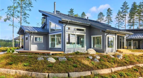 Ещё одна особенность финского дома – просторная открытая терраса. Потолки в помещениях редко выше 2,5 метра – так дом проще обогреть. В последнее время повышенное внимание уделяют энергосберегающим характеристикам, поэтому отопление используют в основном геотермальное – с тепловым насосом. Гаражи финны почти не строят, но всегда предусматривают во дворе навес для машины. Дом обычно оборудуют знаменитой финской сауной. Также в Финляндии не принято ставить заборы.
