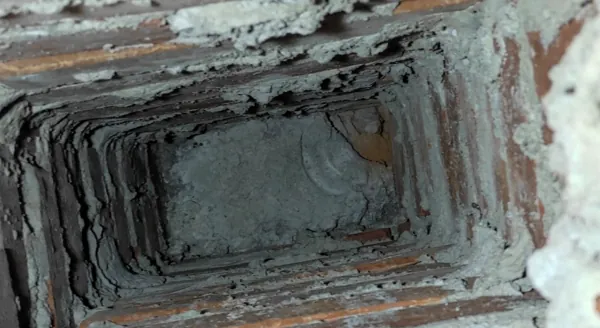 Отправили через Госуслуги заявление. Приехали «трубочисты». Замеры показали 0 тяги, начали пытаться чистить снизу. Сверху ещё 8 этажей, и непонятно какой канал долбить. Вернулись на этаж, продолжили снизу (примерно 2 метра вверх), через два часа смогли процарапать отверстие в углу, пошла тяга... Потом продолжили попытку расширить канал. Когда я фоткал, то увидел арматуру! Что будет дальше – фиг знает.