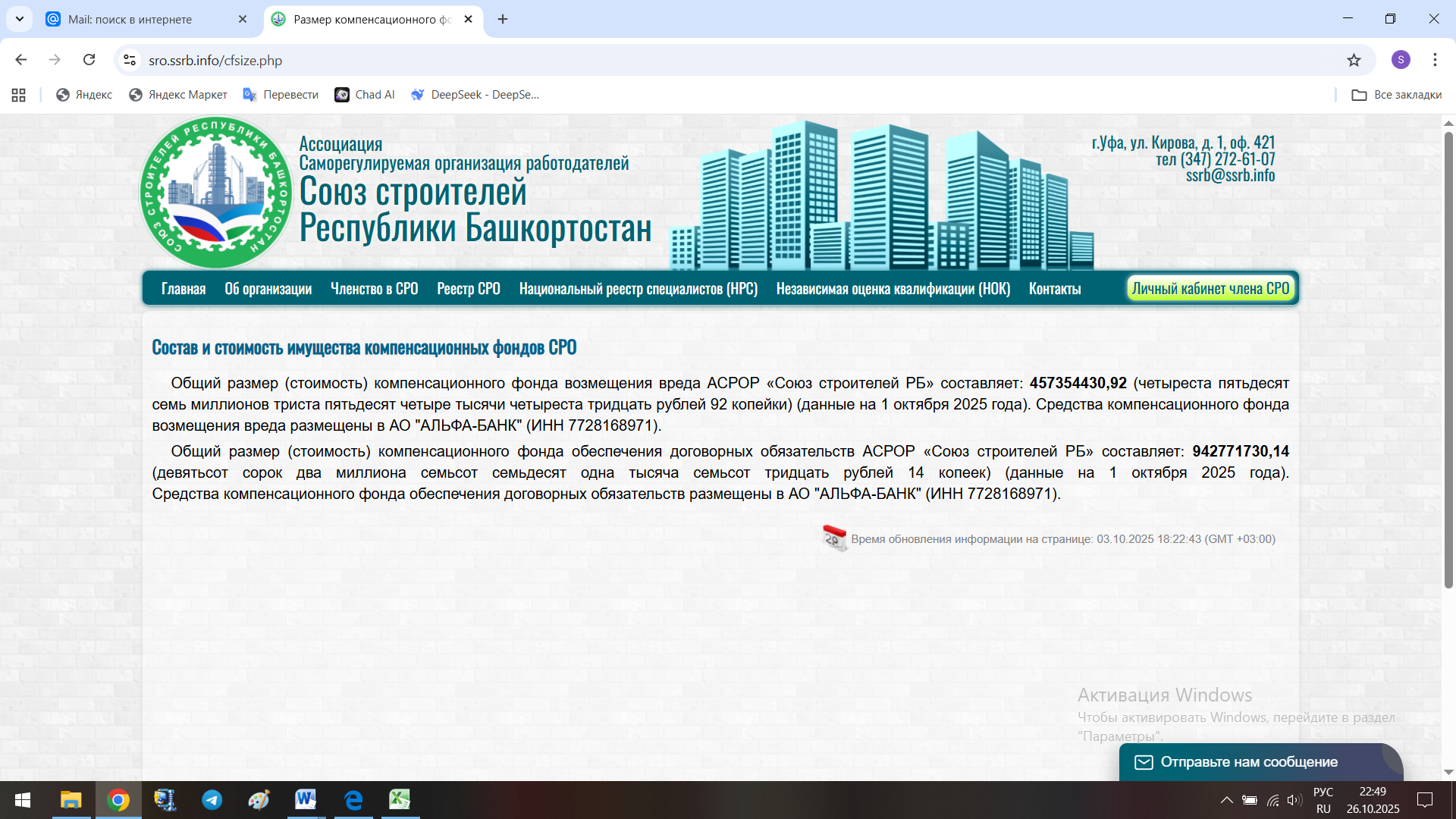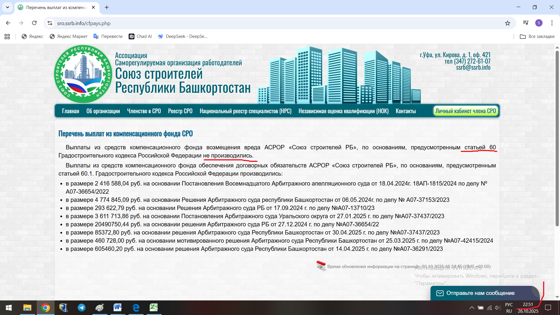 А есть ли эта сумма в компенсационном фонде возмещения вреда Ассоциации Саморегулируемая организация работодателей «Союз строителей Республики Башкортостан»? На момент написания этой части цикла (26 октября 2025 года) в КФ ВВ находится 457.354.430 рублей 92 копейки (приложение 2). Для выплат не хватает примерно 100 миллионов рублей. Но как мы знаем, Градкодекс предполагает при необходимости увеличение взносов (дополнительные взносы) в компенсационные фонды. Подробностей не знаю и не буду в них углубляться. Просто думаю, что при регулярных выплатах из КФ ВВ этот вопрос был бы урегулирован. Возможно, анализ этой ситуации потребовал бы и действий от Национального объединения строителей, в том числе, и в виде изменения градостроительного законодательства.