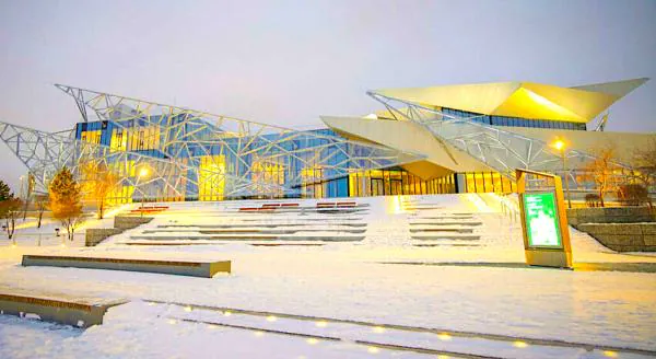 К слову, одной из самых красивых площадок форума стало здание только что построенного национального татарского театра Галиасгара Камала. Проект, построенный с опережением сроков на полтора года, стал квинтэссенцией передовых архитектурных решений и элементов традиционной татарской культуры. Фасад театра сделан из стеклянных треугольников разного размера, закреплённых на стальном каркасе под разными углами. Этот образ является отсылкой к природному явлению «ледяные цветы», которое возникает на местных озёрах зимой. Внутренний же интерьер вдохновлён национальными женскими украшениями и орнаментами.