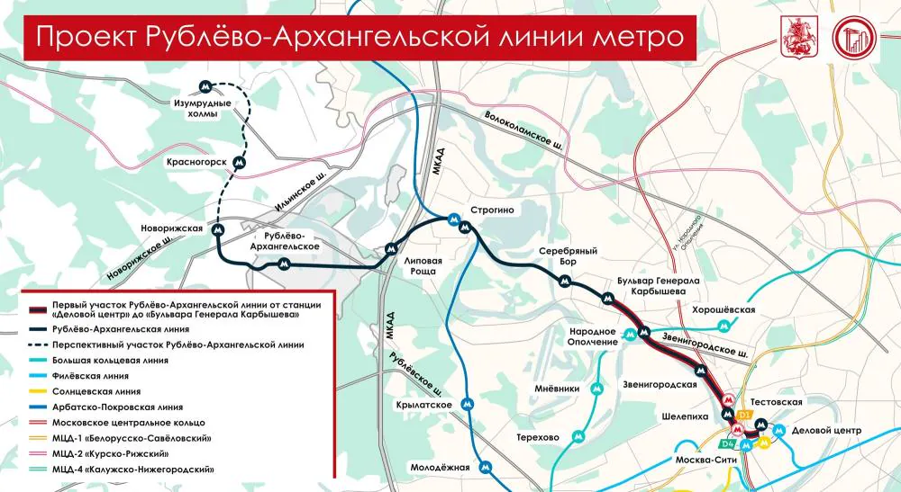 Добавим, что строительство Рублёво‑Архангельской линии метро находится в самом разгаре. В этом году откроют первые пять станций от «Делового центра» до «Бульвара Генерала Карбышева».