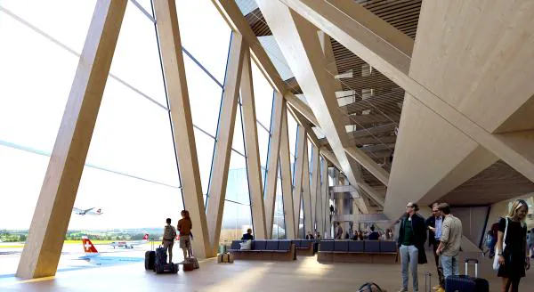 К примеру, недавний международный конкурс проектов для крупнейшего терминала аэропорта в Цюрихе выиграло архитектурное бюро, выдвинувшее концепцию деревянного сооружения. Проектировщики предложили использовать дерево как для основы конструкции, так и для её внутренней и внешней отделки. Такую идею жюри конкурса посчитала весьма необычной и свежей, ведь преимущественно объекты транспортной инфраструктуры строятся из бетона, стекла, пластика и прочих искусственных материалов.