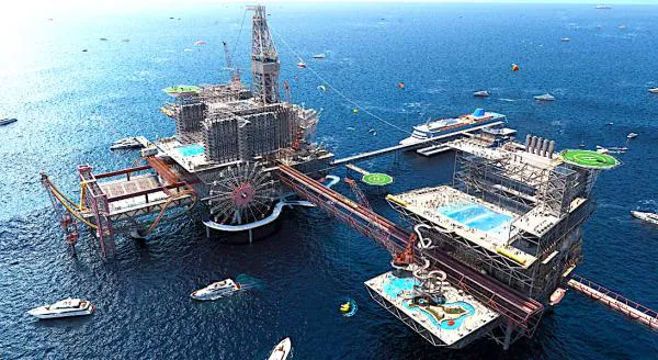 Гигантский курорт с настоящим парком аттракционов на нефтяной вышке это прямо что-то очень на богатом….))
