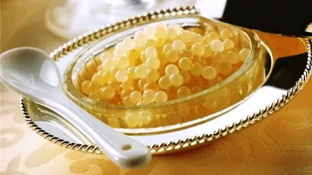 Что ж, теперь Вы знаете, что в мире есть ещё и такая. Это действительно особенная икра: рыба, которая её мечет – белуга альбинос, возрастом от 60-ти до 100 лет, которая весит целую тонну. Икра обладает жемчужным цветом и упругой текстурой. Её продают в золотых контейнерах и в очень ограниченном количестве, потому что, к сожалению, белуги – это вымирающий вид как раз из-за икры. Если вдруг вознамеритесь купить такое дорогое кушанье, то проще всего это сделать в Иране.