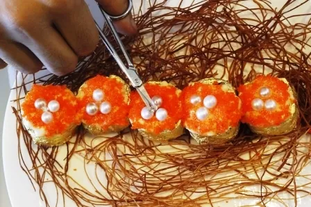 На что только не идут люди ради любви. Вот, например, чтобы признаться своей половинке в чувствах, можно заказать такие суши на Филиппинах. Обернутые в съедобную золотую фольгу в 24 карата и с жемчужинами сверху скажут все за Вас, поверьте. В составе японский рис, артезианская вода 70-летней выдержки, фуа гра, норвежская семга, мариновый огурец, манго, дикий шафран, крабовое мясо, 12-летний бальзамический итальянский уксус и, приготовьтесь, майонез со сливочным маслом! Венчают все это дело маленькие бриллианты весом по 0,2 карата. Красивое признание.