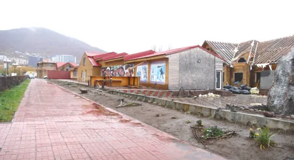 Вместо обещанных аутентичных домиков в стиле коренного камчатского населения, на берегу озера стали появляться громоздкие бревенчатые сооружения в псевдонародном стиле, напоминающие деревянные бани или дешёвые туристические постройки, грубо имитирующие древнерусское зодчество. Аналогичные архитектурные шедевры часто встречаются на обочинах крупных шоссе в качестве мотелей или придорожных столовых.