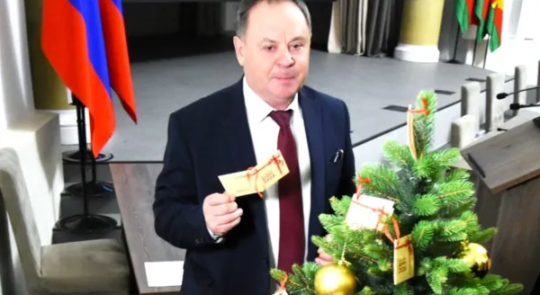 Павел Иванович первым подошёл к увешанной пожеланиями ёлке и снял с ветки дерева открытку, в которой было написано желание воспитанницы интерната Марины Климовцовой. Она хотела бы стать обладательницей пушистого блокнотика, наушников и карты памяти. Руководитель саморегулируемой организации отметил, насколько приятно делать подарки детям: