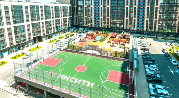 Нельзя не упомянуть и об инновационных многоуровневых дворах на высокой платформе. На первом ярусе размещается парковка, на втором – детские и спортивные площадки. Последние представляют собой многофункциональные зоны для занятий спортом с профессиональным покрытием для футбола, баскетбола и волейбола. Любители спокойного отдыха могут расположится в зоне барбекю, в которых есть необходимое оборудование для готовки, места для мытья посуды и туалеты.