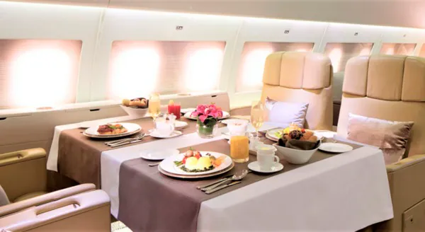 Уже непосредственно на борту VIP-пассажиров ждут удобные широкие кресла с увеличенным расстоянием между сидениями. Скоротать полёт помогут индивидуальная система развлечений Panasonic с регулярно обновляющейся музыкальной и кинопрограммой, прохладительные и алкогольные напитки, сервировка блюд в фарфоровой и стеклянной посуде.