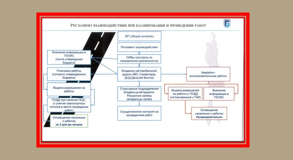 Это была первая хорошая новость. Вторая – региональное Министерство транспорта представило схему регламента взаимодействия заказчиков и подрядных организаций по капитальному ремонту дорожно-уличной сети. Стоит отметить, что накануне заседания рабочей группы Минтранс обсудил документ с инициатором данного вопроса – генеральным директором Ассоциации «Сахалинстрой» Валерием Мозолевским, а также Министерством ЖКХ и Администрацией города Южно-Сахалинска. То есть Минтранс сделал первые шаги на поле проектного управления реализации данного проекта.