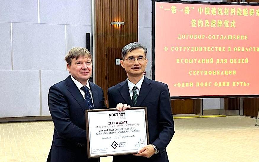 Президент Национального объединения строителей Антон Глушков вручил сертификат руководству Группы компаний «Beijing BBMG Group Co., Ltd.» (Группы компаний BBMG), которая стала базовой организацией Китайско-Российского института инспекции строительных материалов «Один пояс, один путь».