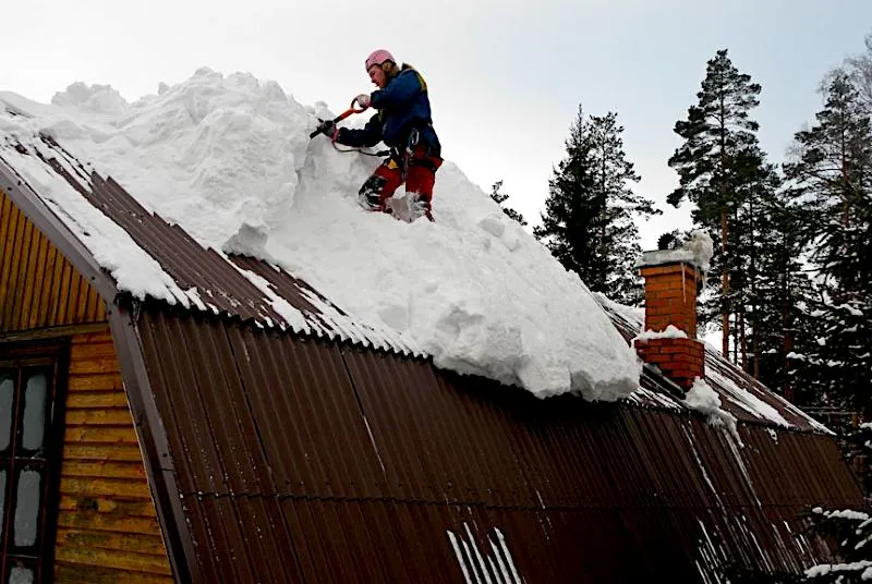 Совсем иначе обстоит дело со скатными крышами. Ходить по ним, особенно в гололёд, смертельно опасно. В этом случае снег убирают дистанционно, стоя на земле, с помощью специальных скребков, которые также называют скреперами. Конструктивно это, как правило, телескопическая рукоять из металла или пластика, на конце которой закреплена рабочая лопасть.