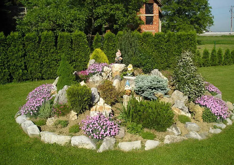 На фото есть декоративная ель и туя, они хоть и медленно растут, но растут. Через несколько лет уже не будет такого эстетического вида.