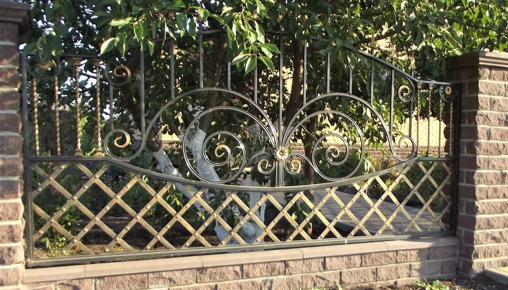 Помимо извилистых плетений, их также украшают коваными металлическими изделиями. От цветов до целых барельефов, которые могут занять внимание гостя не хуже увлекательной передачи. Самыми распространёнными материалами в этом типе ограждений по-прежнему остаются чёрные металлы. Однако также применяются и нержавеющая сталь, и алюминий. Последний быстро набирает обороты среди производителей ввиду своей устойчивости к коррозии и лёгкости.