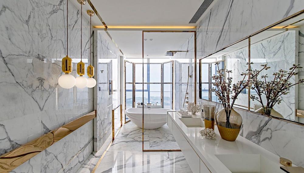 Ванная комната – это, можно сказать, царство мрамора. Здесь он чувствует себя как дома. Влажность, пар, брызги воды – его родная стихия. Отделка стен и пола мрамором создаёт ощущение чистоты, прохлады и СПА-центра. Особенно выигрышно смотрятся мозаичные панно или комбинация полированных и состаренных поверхностей. Например, глянцевая полировка на стенах визуально расширяет пространство, а матовая, так называемая «сатиновая» или «кожистая» обработка на полу – делает его менее скользким и придаёт тёплый, бархатистый оттенок.