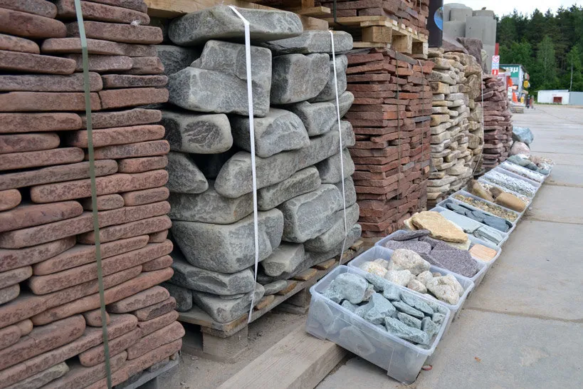 Полевой камень для продажи предлагается в виде смеси образцов разных размеров или отсортированных по размеру. Вы можете купить отдельно большие валуны. Полевые камни можно разбить на более мелкие с острыми краями. При необходимости более тонкие плиты с неровными поверхностями изготавливаются из расщепленных камней. Полевой камень можно разрезать на обычные плиты и отшлифовать, но это делается крайне редко, потому что тогда он потеряет свою естественную гравировку.