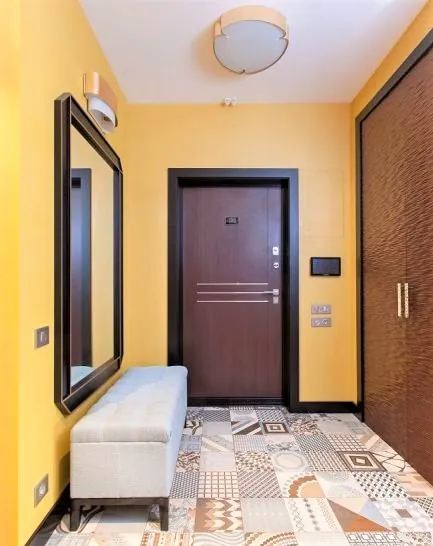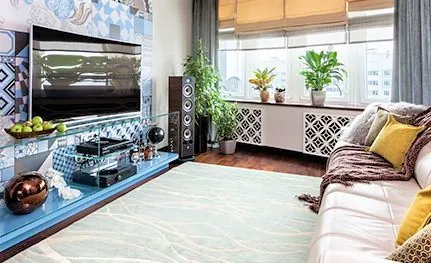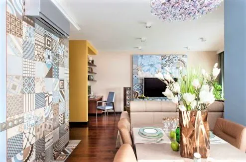 Оформленная орнаментом панель под телевизор – самый выразительным элемент гостиной, который «рифмуется» с плиткой на стене. Эта плитка, в свою очередь, создаёт сложный декоративный объём переходом на стену коридора и объединяет цветовую палитру общественной зоны.