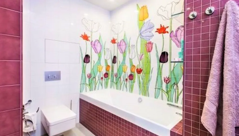 В цветах самого холодного времени года также реализован интерьер хозяйских спальни и санузла, а атмосферу весны и лета передают детская комната и вторая ванная. При этом автор проекта особенно подчеркивает присутствие авторских предметов мебели. Так, по эскизам сделана почти вся мебель в комнате девочек, тумба под раковину в ванной в цветах панно из тюльпанов, а в спальне на заказ изготовили встроенный шкаф с фрезеровкой в виде кругов, повторяющий орнамент на обоях.