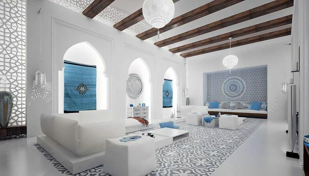 Характерной чертой современных восточных интерьеров становится геометрия и урбанистические нотки. Жёсткие линии и чёткие грани то и дело прорезают плавные восточные узоры, добавляя им особый шарм. На смену традиционным приземистым конструкциям приходят невесомые высокие потолки. Прослеживается удачный симбиоз старинных техник декора с инновационными материалами. Например, росписи и резьба по дереву отныне изготавливаются с помощью современных станков и программ.