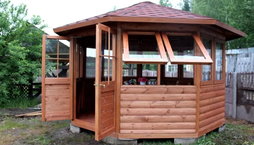 Многоугольные. Многоугольные строения, насчитывающие от 5 до 12 углов, будут хорошо смотреться только на просторном приусадебном участке. В них можно обустроить отличное место для проведения праздничных семейных застолий и сбора многочисленных друзей за вкусным шашлыком. Это сложные строения, для возведения которых требуется особенно тщательная разработка проекта и чертежей. Они красиво выглядят даже после нескольких лет использования.