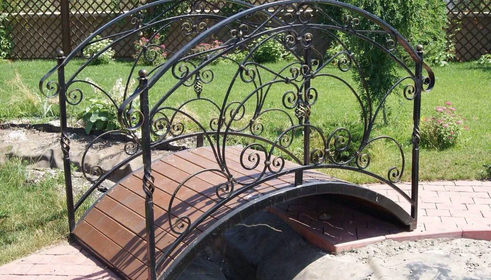 Ещё одной важной деталью ландшафтного дизайна является декоративный кованый мостик, который зачастую располагают над искусственно созданным водоёмом. Ещё буквально недавно эти мостики делали из дерева, но из-за недолговечности таких изделий покупательский спрос сместился в сторону металлических конструкций.