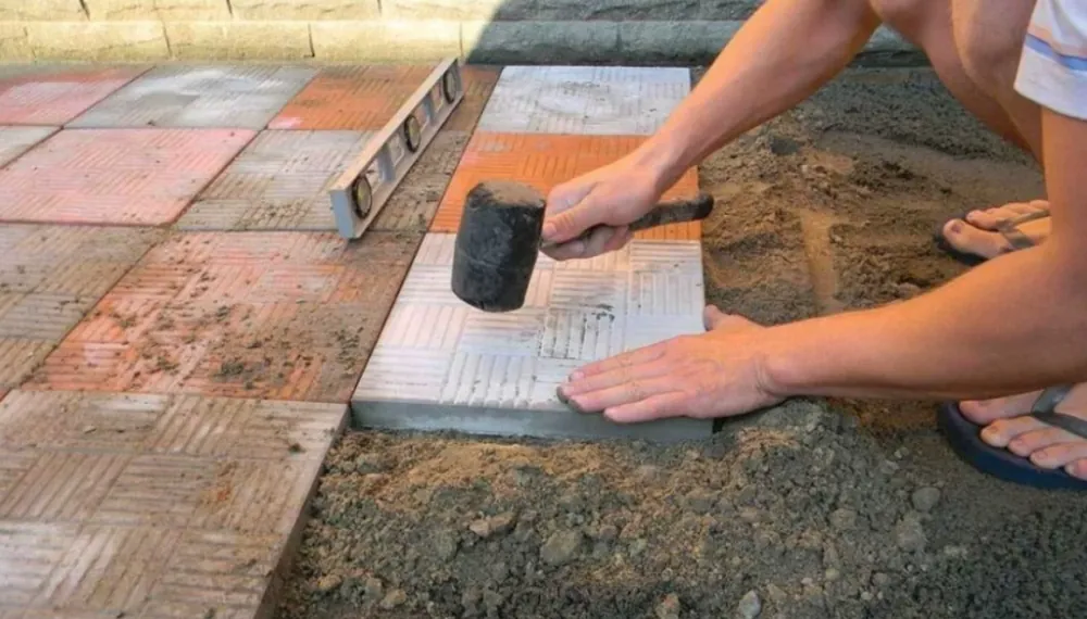 После готовности основания выполняется непосредственно укладка тротуарной плитки.