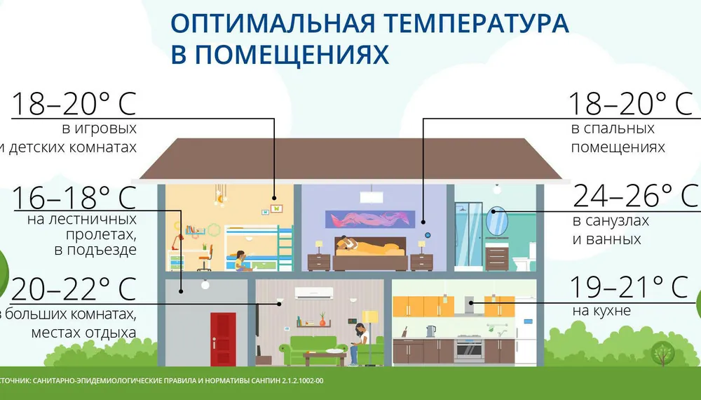 Допустимые колебания температуры – помимо запрограммированных изменений в течение дня – представляют собой значения в диапазоне +/- 0,5 градуса Цельсия, хотя для некоторых людей эти различия могут показаться неудобными. Хорошее самочувствие также будет обеспечиваться за счёт достаточного воздухообмена, обеспечивающего свежую дозу кислорода и поддержание влажности на уровне 40-60%.