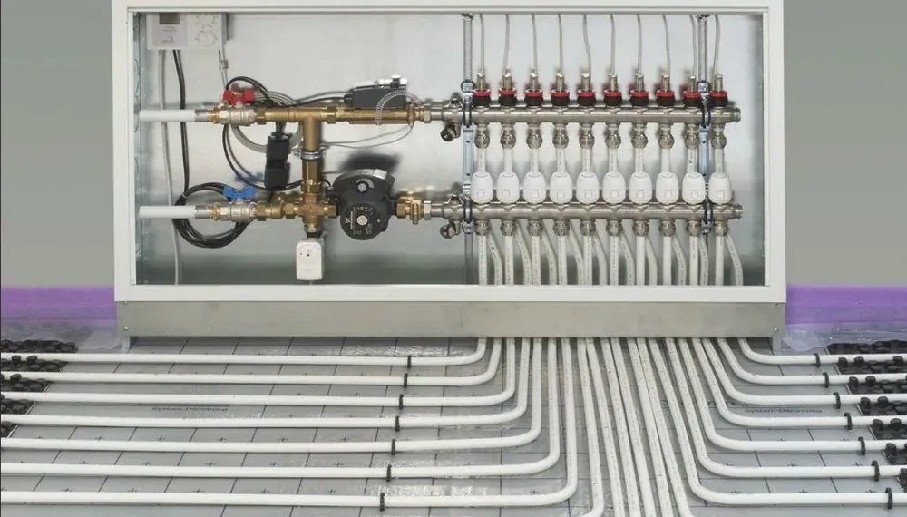 Система водяного панельного отопления состоит из труб, проложенных в стяжке пола или штукатурки, коллектора, к которому подключаются отдельные контуры труб отопления, и системы управления, адаптированной к остальной системе отопления.