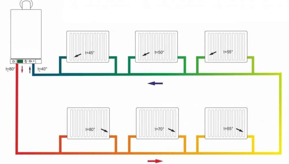 - Для компенсации охлаждения воды в конце «цепочки» устанавливали радиаторы с большим количеством секций.