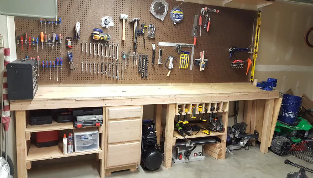 Какого бы размера ни был настенный экран, всех инструментов на нём не разместить. Для того, что используется от случая к случаю, необходимы ящики. В самых простых вариантах это один-два выдвижных элемента под столешницей. Но гораздо удобнее конструкции с полноценными тумбами. Частному мастеру, как правило, достаточно одной или двух тумб. Громоздкие трёх- и четырёхтумбовые монстры, занимающие половину помещения, – удел крупных производственных цехов, а не домашней мастерской.