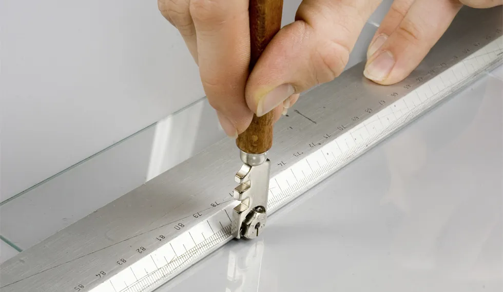 Для резки стекла большой толщины необходимо использовать стеклорез с зубчатым лезвием. Он позволяет надрезать поверхность стекла на большую глубину, что облегчает последующую ломку.