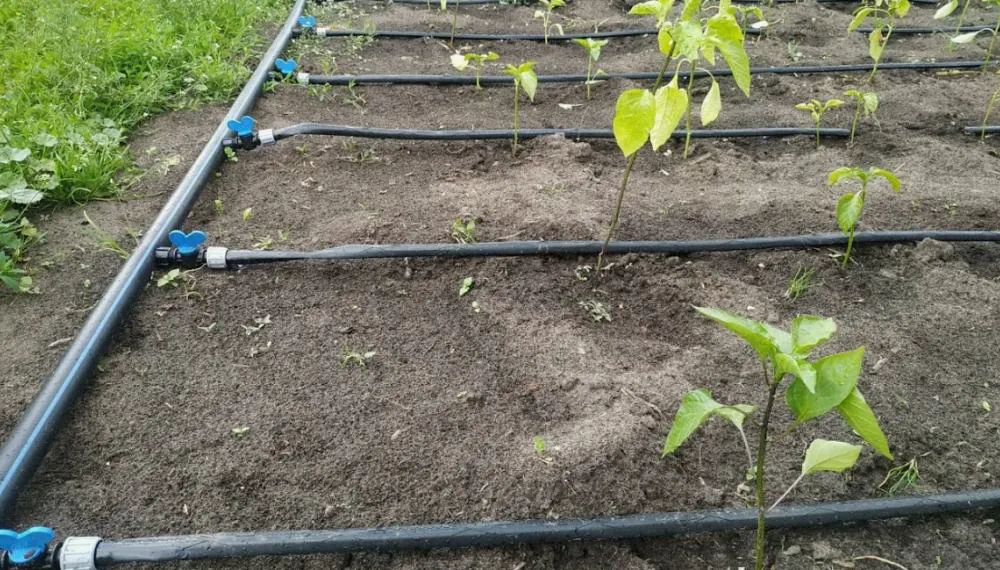 - Разложите трубы или ленты вдоль грядок, разместив капельницы рядом с растениями.