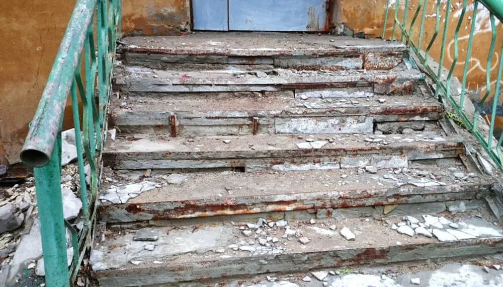 В ходе проверки выяснилось, что козырёк входа в нежилое помещение № 37 имеет повреждения, деформации, прогибы и щели между отдельными элементами покрытия. Ступени лестницы в это помещение имеют трещины и сколы на керамическом покрытии, а несколько керамических плиток и вовсе отсутствуют.